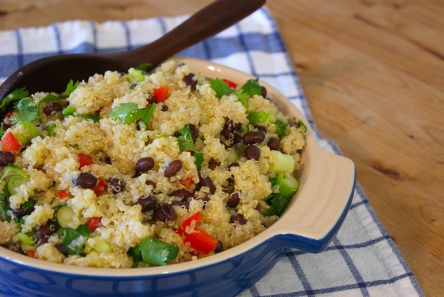 Place quinoa in a large bowl to cool. Combine oil, juice, salt and cumin in a small bowl. Whisk and pour over cooled quinoa. Toss well. Add cilantro, green onions, jalapeño, red pepper and black beans. Toss.
