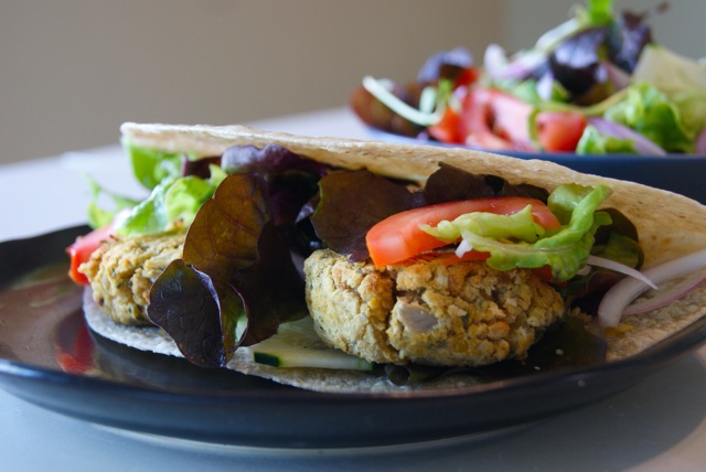 Place patties on a cookie sheet lined with parchment paper. Bake 10-2 minutes until golden brown on top. Flip and bake another 10-12 minutes until other side is golden brown. Remove from oven and serve hot. Serve with vegetable salad  (recipe below) and hummus.