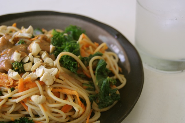 Heat oil in a wok over medium high heat. Add the kale and stir until cooked and beginning to brown in spots. Add the carrots and turn down the heat a little, stir. Add the noodles to the wok. Add the peanut sauce, reserving about 1 teaspoon. Stir until everything is combined.