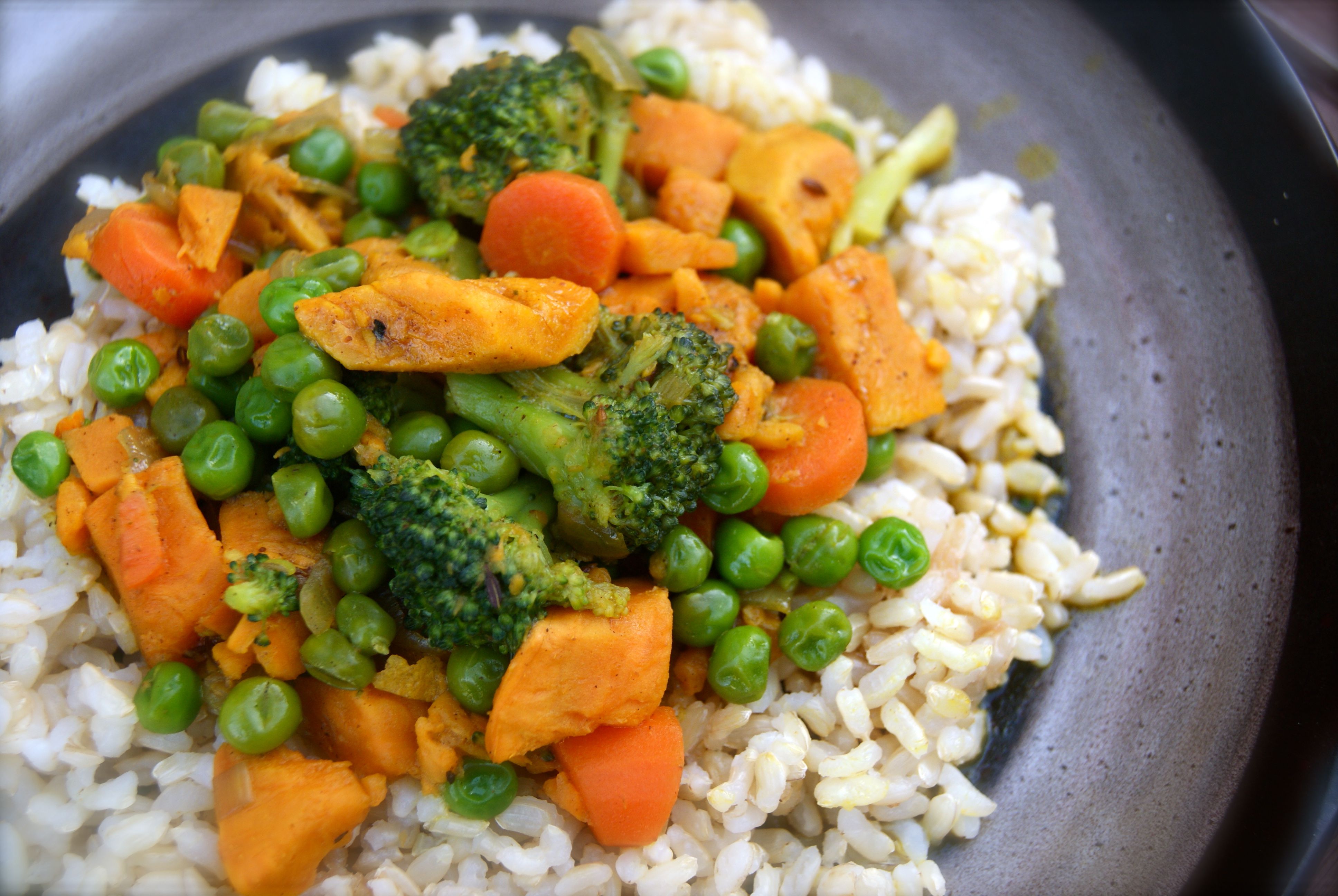 Add the sweet potatoes and carrots to the spice mixture and toss to coat. Add the coconut milk and allow to simmer, covered, until the vegetables are cooked through (about 15 minutes). Add the broccoli and peas and allow to simmer, covered, until broccoli is tender (about 7 minutes). Add salt, to taste, and serve warm.